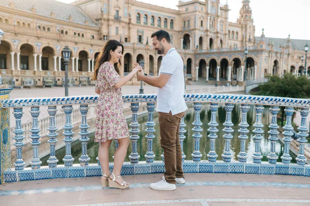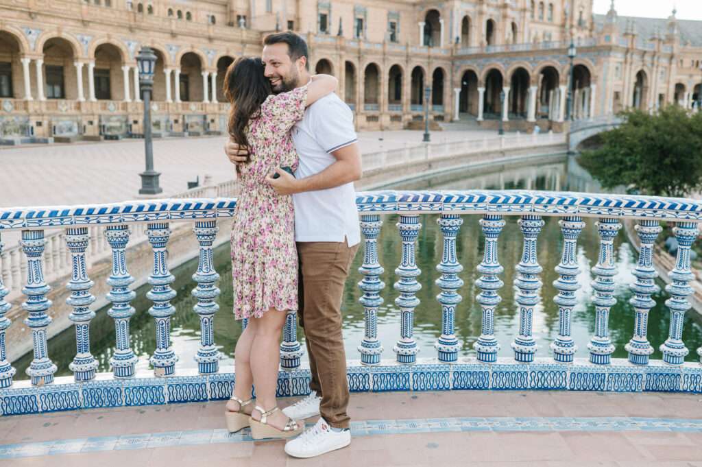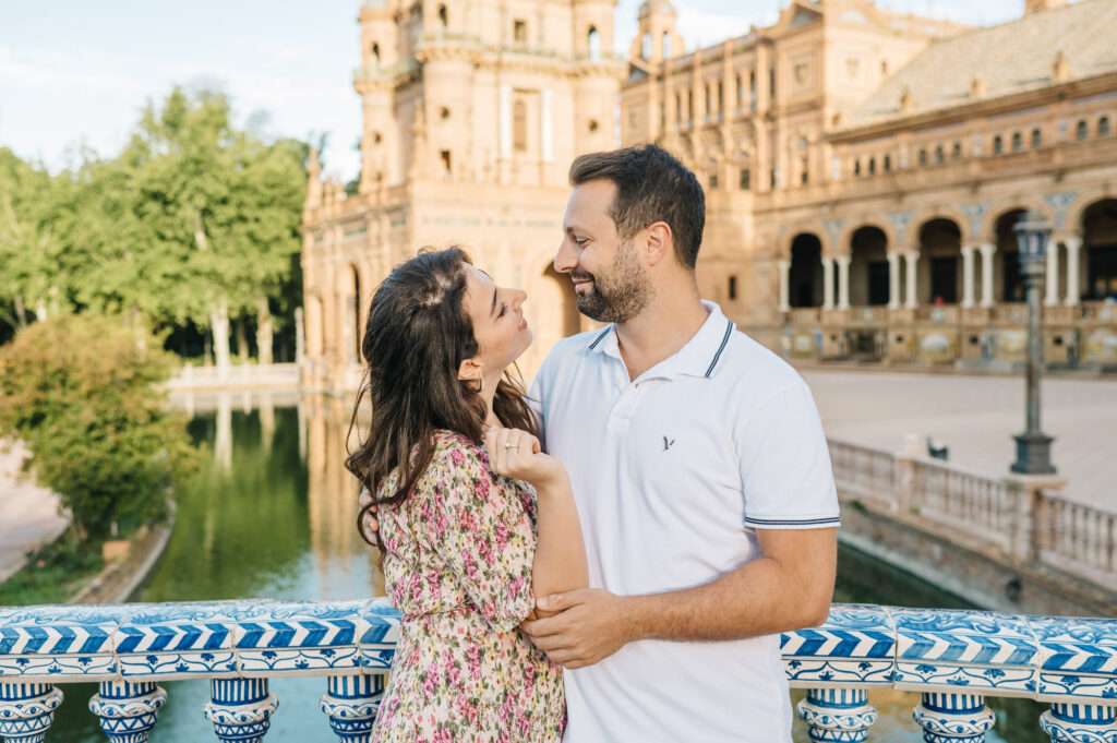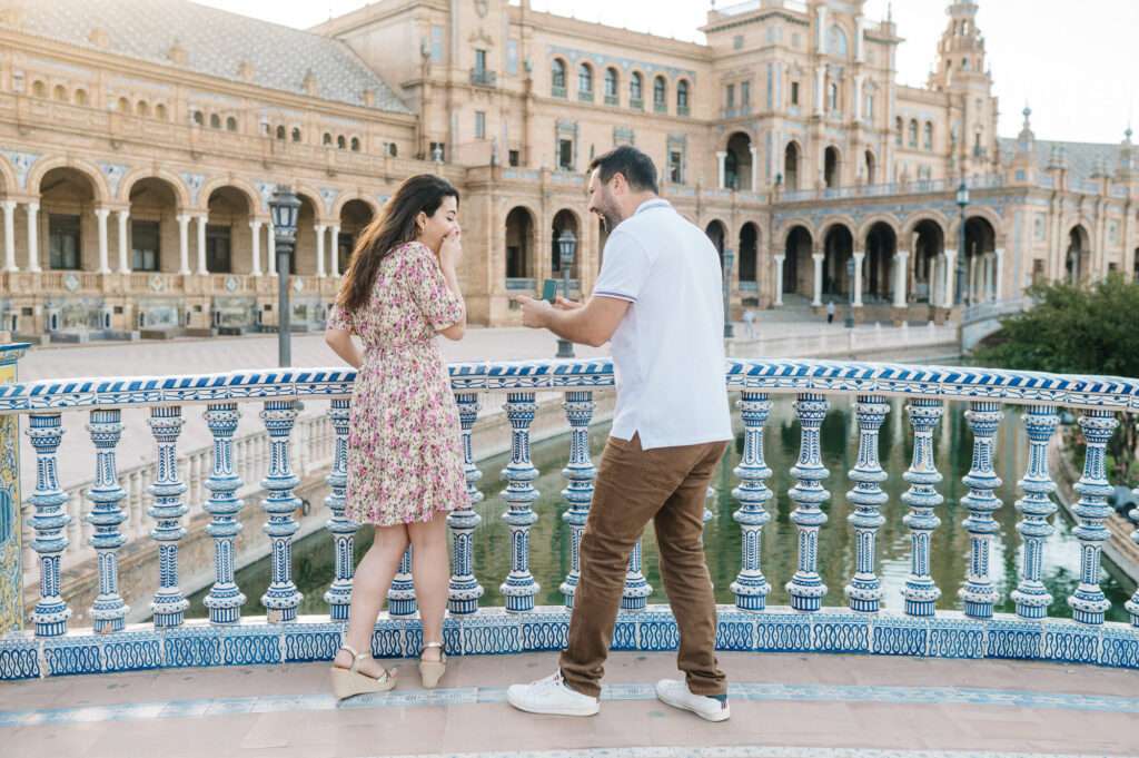 A surprise proposal in Seville is one of the most unforgettable moments a couple can experience, and few places are as romantic and iconic as Plaza de España. With its grand architecture, colorful ceramic bridges and reflections over the canal, it creates the perfect setting for an emotional and intimate proposal.