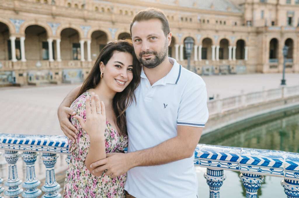 In this moment, the couple walks together across one of the beautiful tiled bridges overlooking the water. The atmosphere is calm and romantic, with the magnificent building of Plaza de España rising in the background. Suddenly, he stops, kneels down and opens a small ring box. The surprise is immediate — her hands cover her face in shock and happiness while she realizes what is happening.