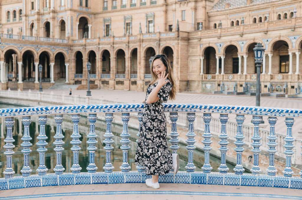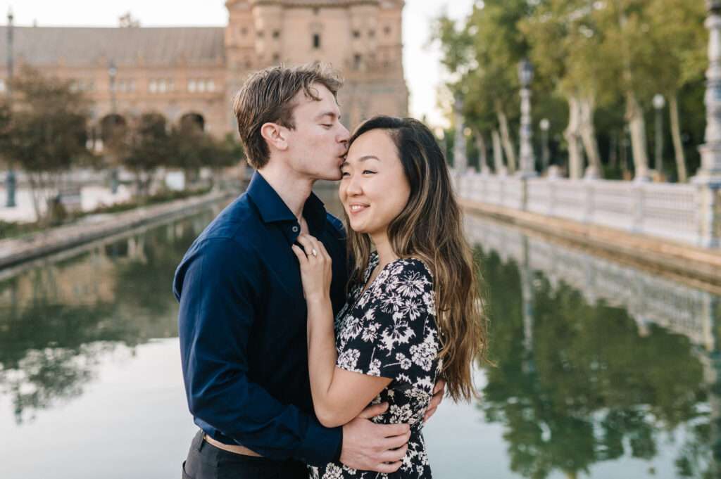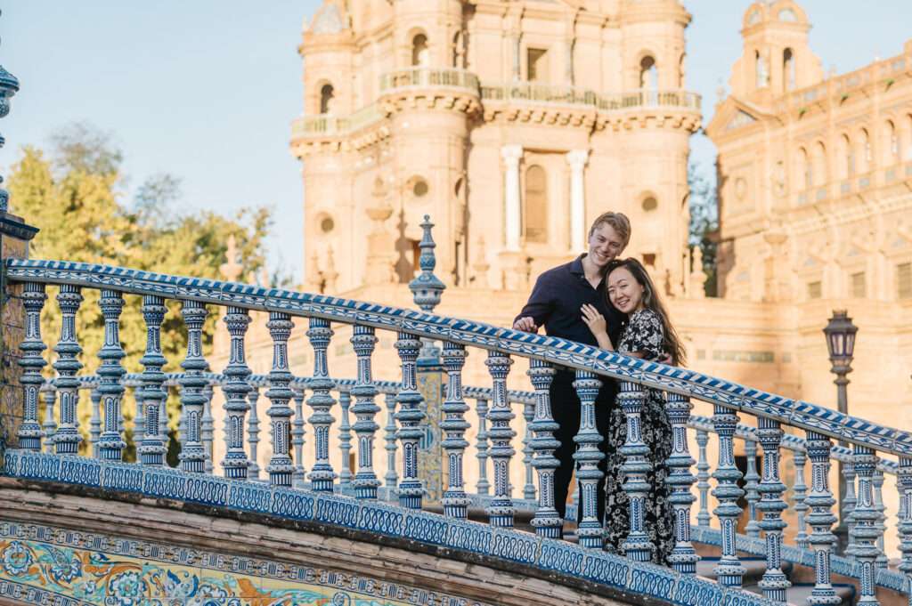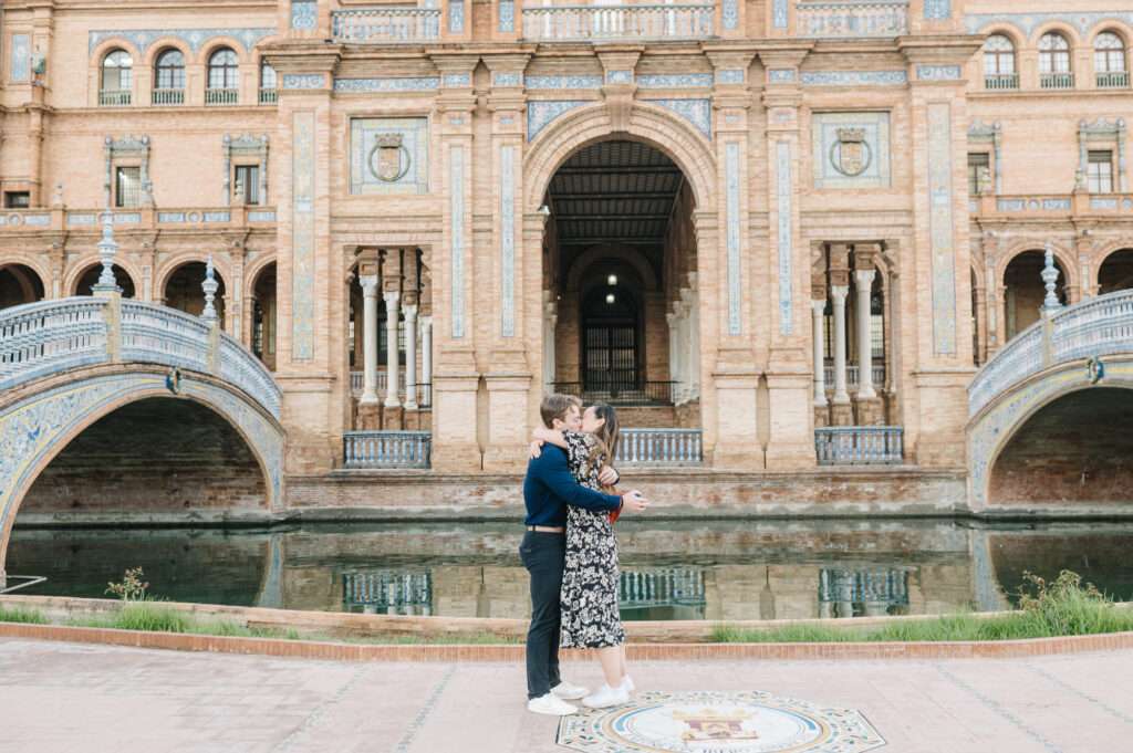 There are many beautiful spots in Seville, but Plaza de España offers a unique combination of romance, space and breathtaking views. Early in the morning, the square is quiet and peaceful, making it ideal for a private and emotional moment. The soft Andalusian light reflects beautifully on the water and the ceramic details, creating an unforgettable atmosphere.